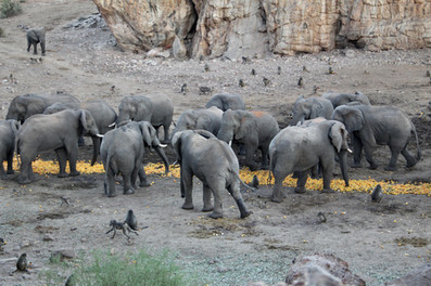A great exodus to the legendary Nottingham Estate after our time at the farm, once again finding ourselves on the great grey green greasy limppopo river, and it was indeed surrounded by fever trees this time - beautiful green trunked giants with spreading flat top canopies. Away from the river the vegetation is more scarce, but the geology / rock formations are from a different planet all together. Apart from being in a fairly remote, interesting part of the world with some excellent bush camps, Nottingham Estate is first and foremost a citrus orchard - a couple hundred acres along the edge of the river. The highlight of any visit is to go out to Fly Camp, in the ‘hinterland’ where they drop a pile of left over oranges, daily, for the elephants and baboons - primarily as a decoy to keep them away from raiding the orchards, but does make for some good elephant watching. We enjoyed two evenings up there, with beautiful sunsets (of which we had missed out on for a good few days with said inclement weather!), and dinner - a more exotic location for a family feast finale would be hard to find!